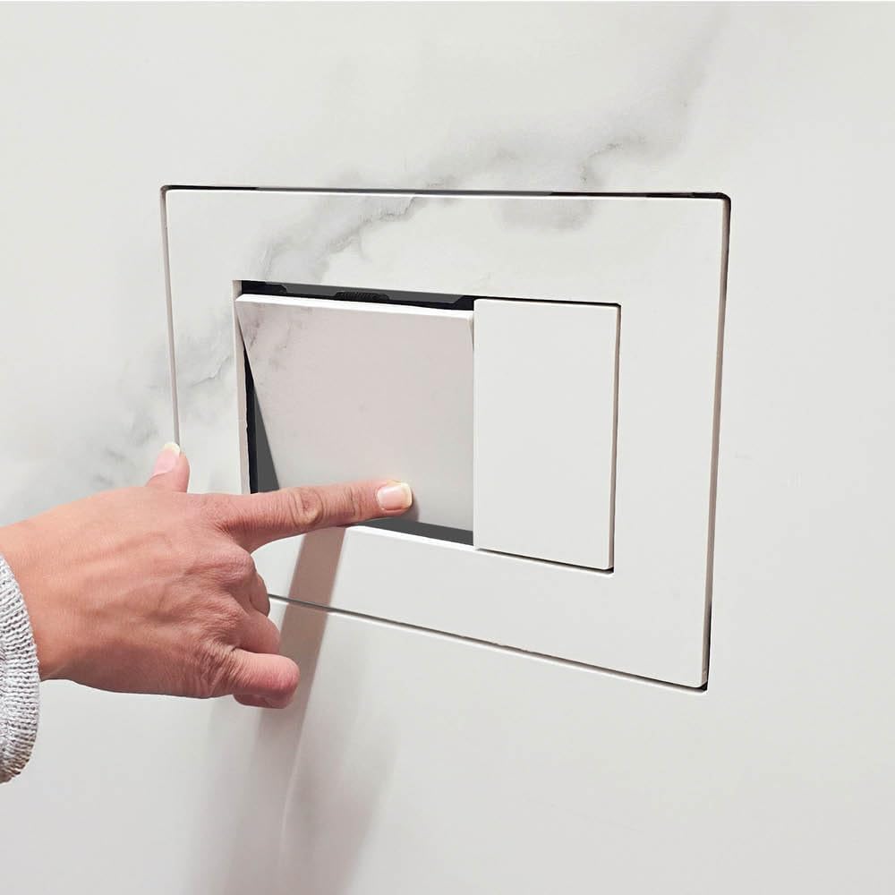Paslėptas nuleidimo mygtuko mechanizmo komplektas, skirtas moderniems sanitariniams sprendimams, kai siekiama vientiso plytelių dizaino be matomų mygtukų.